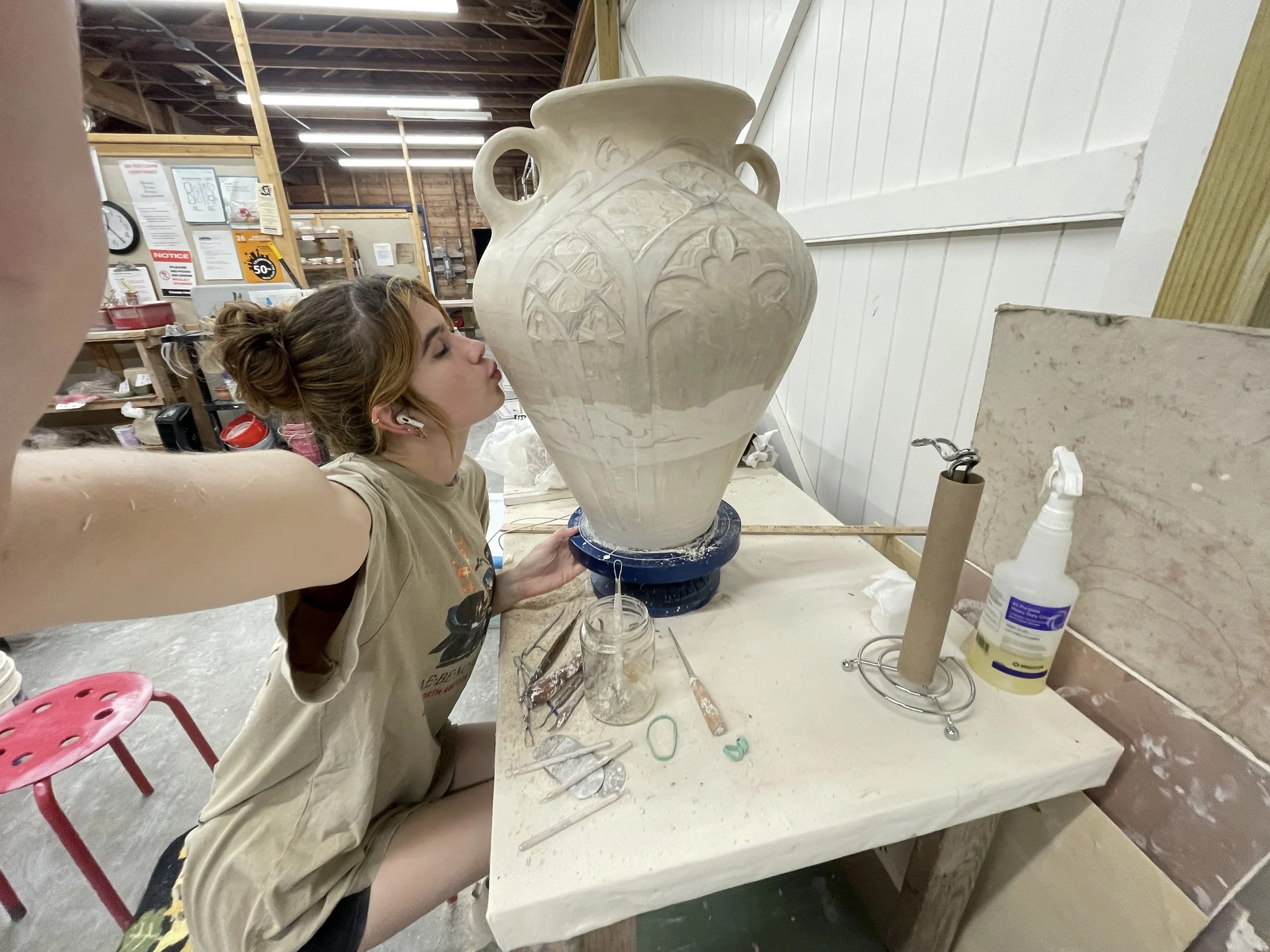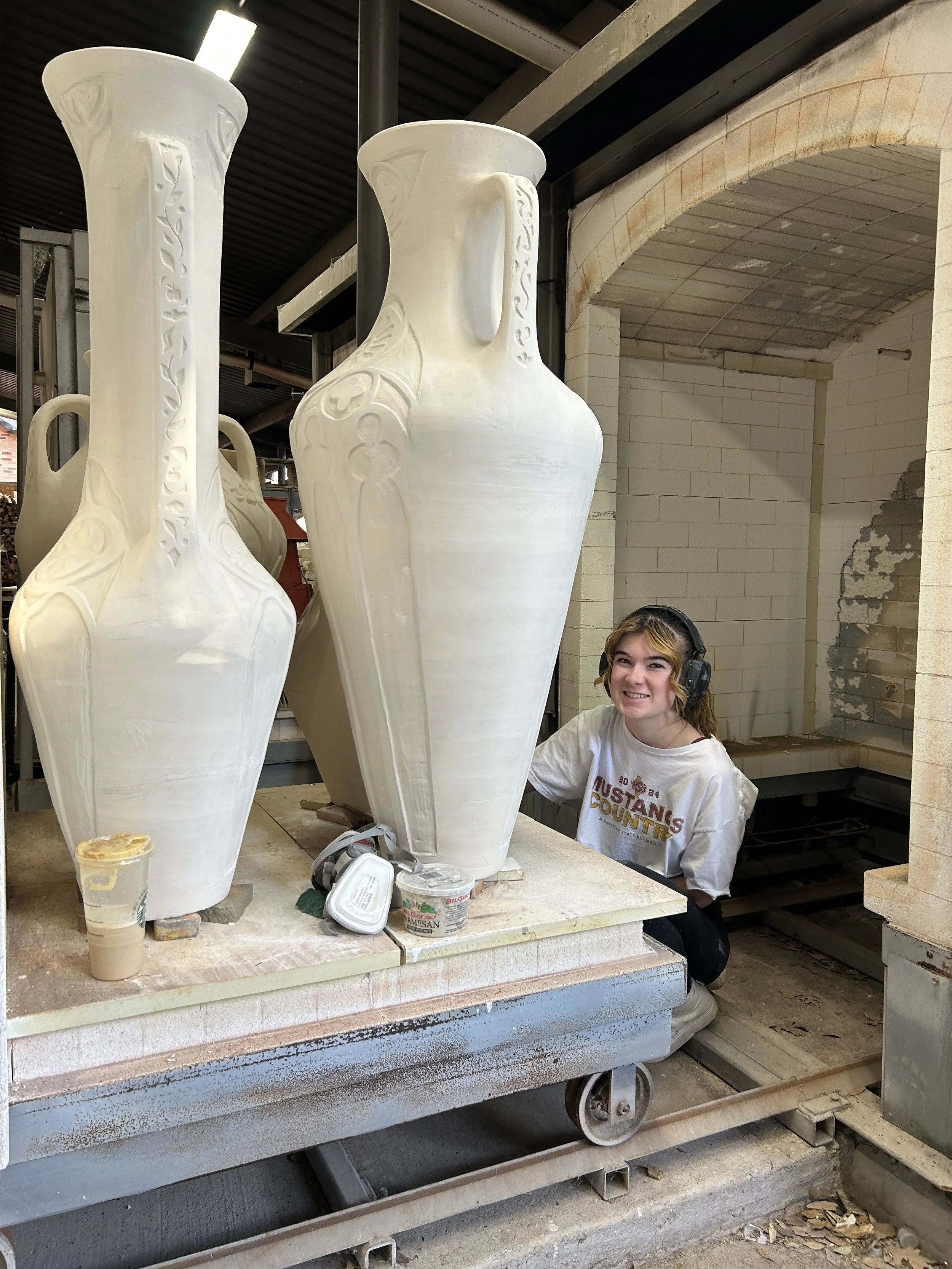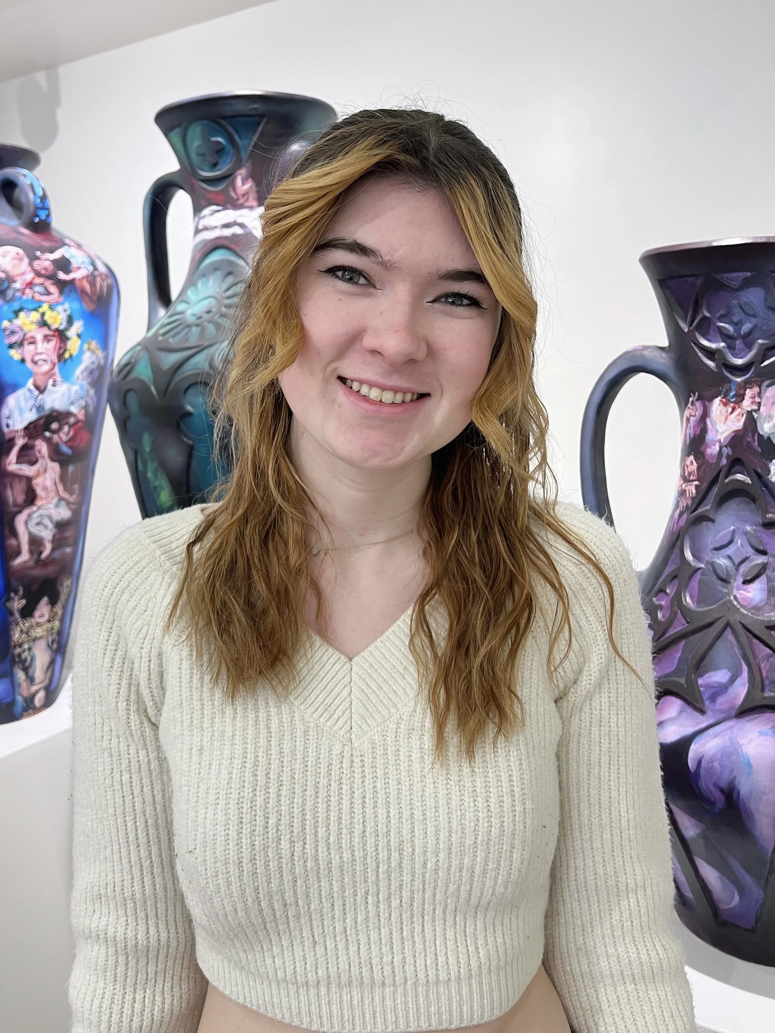 Mary Grazer is a ceramic artist and painter based in Fort Worth, Texas. She is currently in her final year of undergraduate studies in art education at Midwestern State University. Following graduation, she plans to pursue post-baccalaureate programs, residencies, and an MFA. Her art has been exhibited across North Texas and is currently featured in the senior capstone exhibition at the Juanita Harvey Art Gallery. Grazer’s utilitarian artwork explores form and function with playful, illustrative surfacing. Her current body of work focuses on female representation in media and calls the viewer to consider their personal beliefs surrounding womanhood.